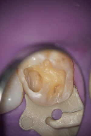 | 治療方法 | 古臭い方法ですが、う蝕検知液で染め出しを行いながら徹底的に除去します。 そこにかかる時間は約40分。 う蝕検知液で染めて→軟化象牙質除去→染め出し→除去 を繰り返します |